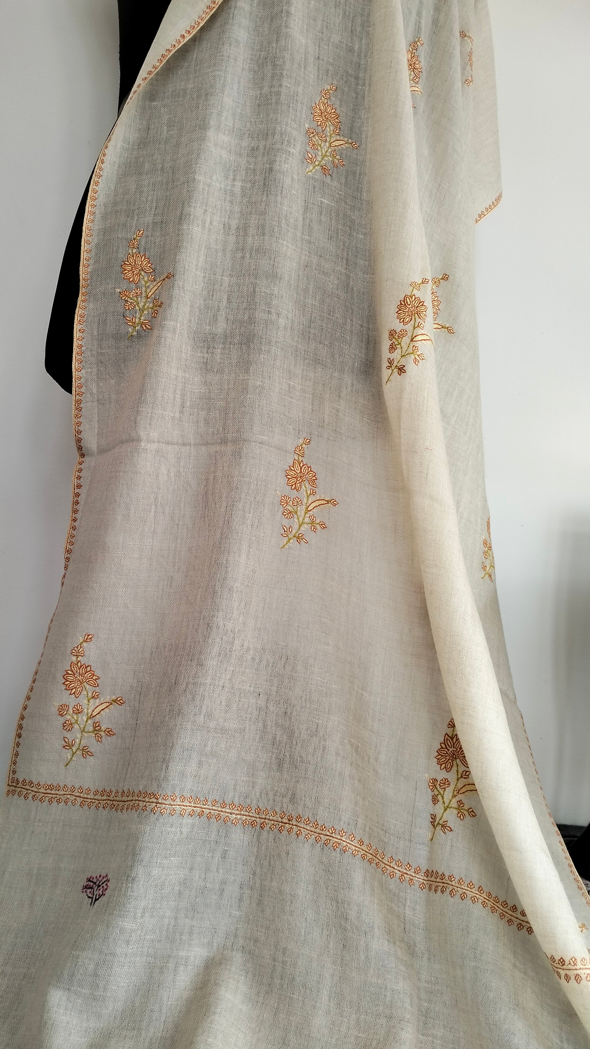 Meticulously embroidered borders and carefully placed floral designs showcase exceptional artisanal work. Elevate your ensemble with this exquisite off-white pashmina stole adorned with masterful floral embroidery in lustrous gold thread work. The lightweight fabric drapes beautifully, featuring delicately scattered floral motifs throughout the expanse of the fabric. The traditional design incorporates intricate border patterns and perfectly positioned botanical elements that add a touch of sophistication. This versatile stole combines timeless craftsmanship with contemporary elegance, making it suitable for both formal occasions and everyday wear. The natural pashmina fabric offers breathability and comfort, while the golden embroidery creates a subtle shimmer that catches light beautifully. Each floral pattern is meticulously crafted, showcasing fine attention to detail in the petals and leaves. Perfect for pairing with traditional outfits or as an elegant accent piece to modern attire.