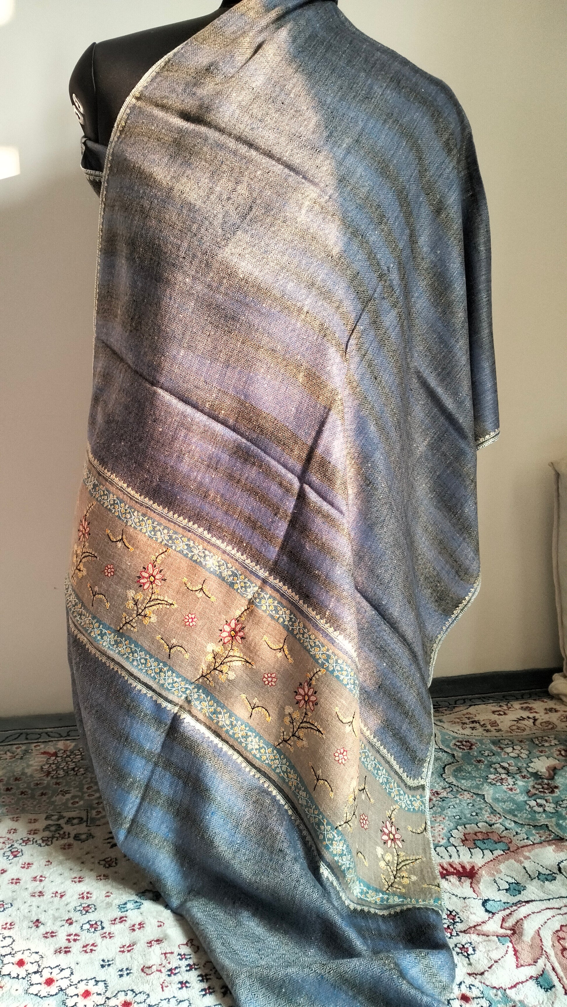 Expertly crafted with super soft cashmere, this hand-embroidered Kashmiri pashmina stole boasts a beautiful blue and tan color scheme. Its modern design and versatile style make it the perfect addition to any outfit. Experience the luxurious comfort and original ikat pattern of this purest pashmina stole.