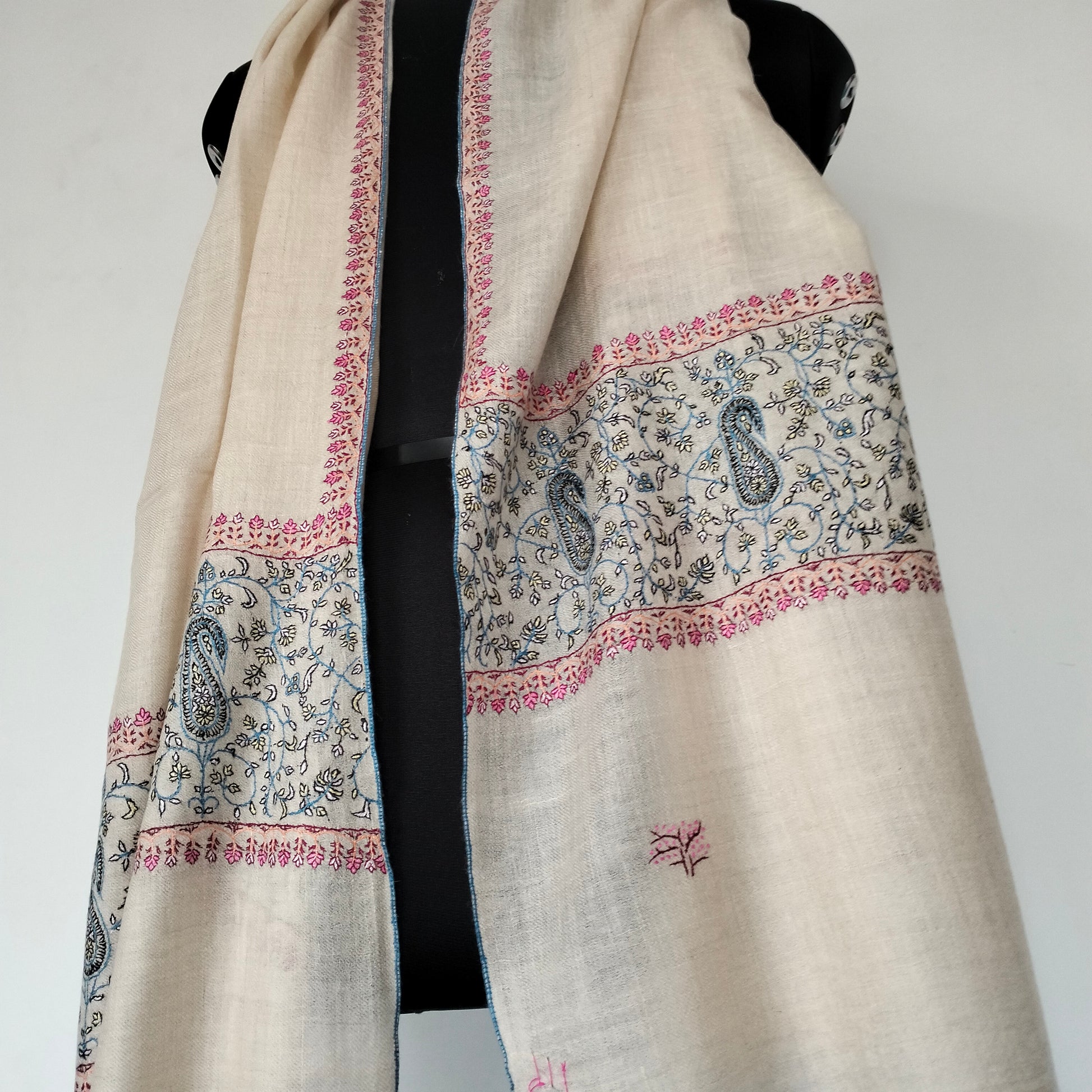 Handcrafted Pashmina white meditation shawl, sozni embroidered changthangi wool kadhmiri robe, soft and warm evening scarf
